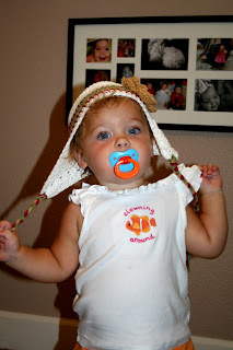 She did this last week. She found her beanie and just had to have it on. She somehow found her binkie and snuck a hit off it.